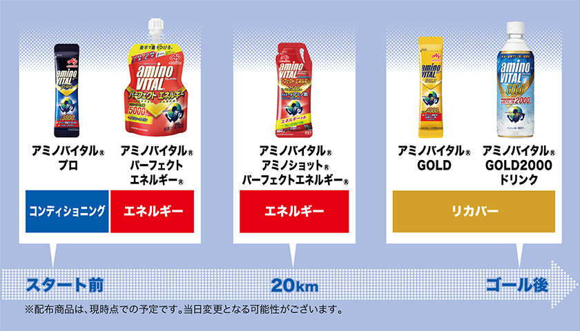 30Kシリーズでは、フルマラソンのレースを想定し、スタート前、コース途中、フィニッシュ後といった適切な補給タイミングでアミノバイタル®をご用意し、皆さんのレース快走の為のトレーニングをフルサポートします。