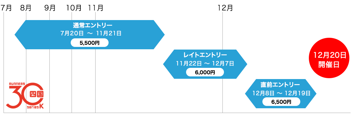 四国30K(12月20日開催)料金表[参加料(税込み)/エントリー期間]参加料(税込み)エントリー期間通常エントリー5,500円7月20日(日)~ 11月21日(金)レイトエントリー6,000円11月22日(土)~ 12月7日(日)直前エントリー6,500円12月8日(月)~ 12月19日(金)