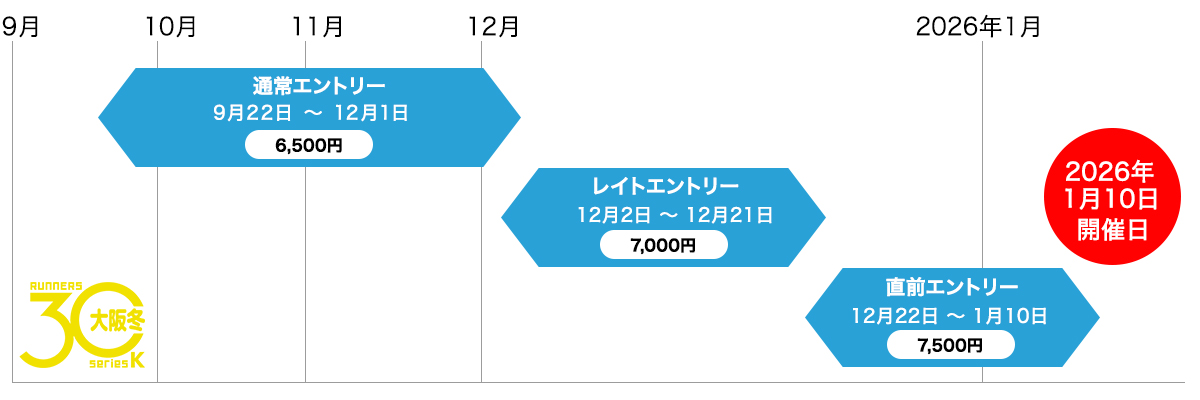 大阪30K冬大会(2026年1月10日開催)料金表[参加料(税込み)/エントリー期間]参加料(税込み)エントリー期間通常エントリー6,500円9月22日(月)~ 12月1日(月)レイトエントリー7,000円12月2日(火)~ 12月21日(月)直前エントリー7,500円12月22日(火)~ 2026年1月10日(土)
