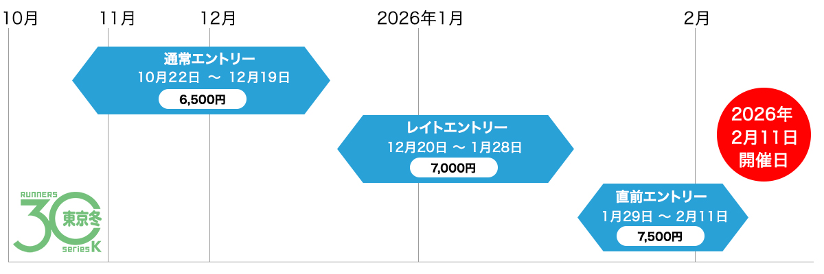 東京30K冬(2026年2月11日開催)料金表[参加料(税込み)/エントリー期間]参加料(税込み)エントリー期間通常エントリー6,500円10月22日(水)~ 12月19日(金)レイトエントリー7,000円12月20日(土)~ 2026年1月28日(水)直前エントリー7,500円1月29日(木)~ 2月11日(水)